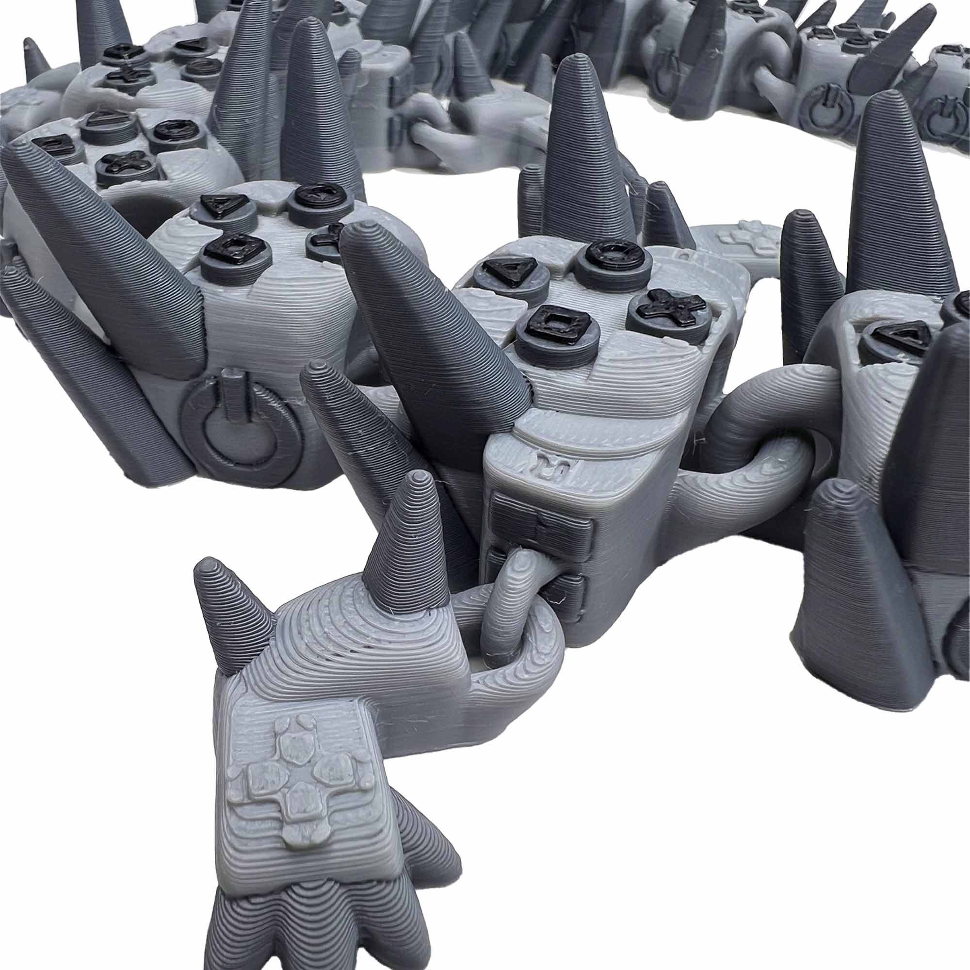 This 3D printed flexi dragon is designed with an PlayStation theme and measures around 40cm in length. Printed in black and grey, the body is detailed with controller buttons, power symbols, and spiked plates, finishing with an PlayStation controller tail. Each segment is fully articulated, allowing the dragon to move and curl into different poses, making it perfect as a display piece or desk accessory.