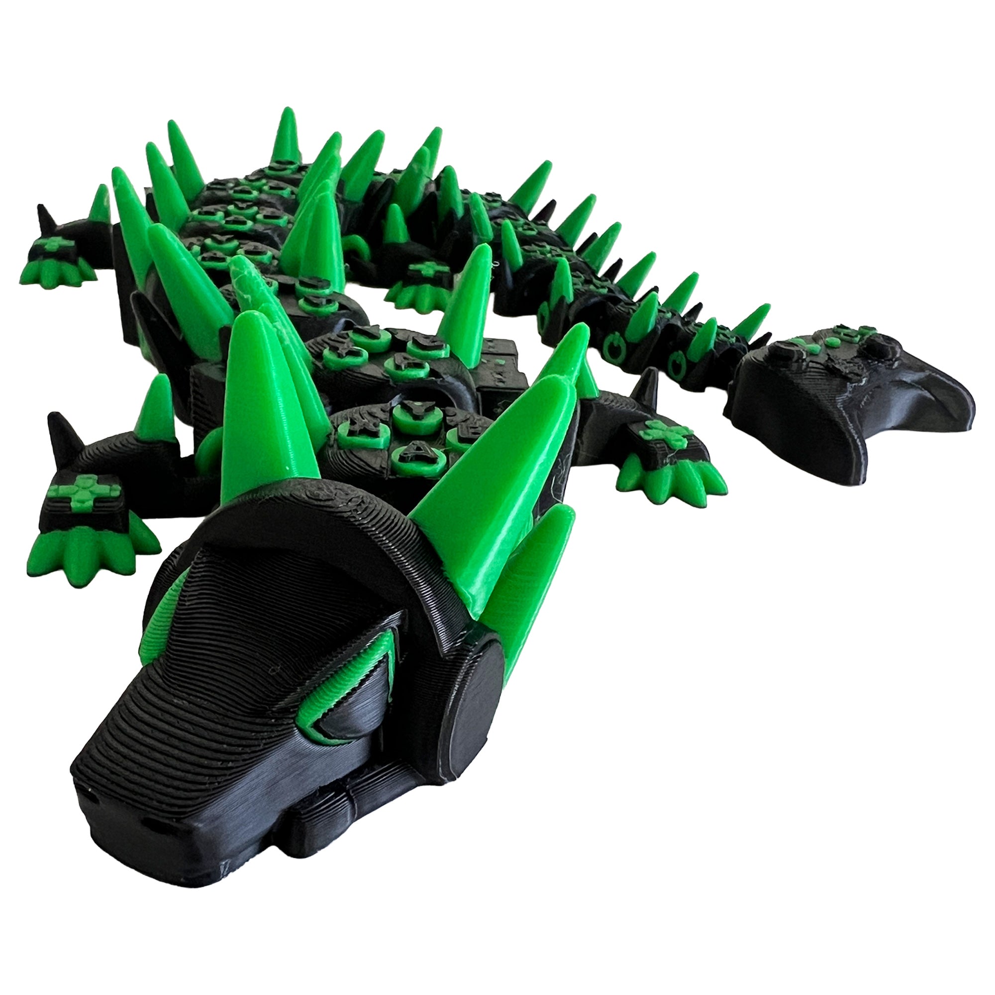 This 3D printed flexi dragon is designed with an Xbox theme and measures around 40cm in length. Printed in black and green, the body is detailed with controller buttons, power symbols, and spiked plates, finishing with an Xbox controller tail. Each segment is fully articulated, allowing the dragon to move and curl into different poses, making it perfect as a display piece or desk accessory.